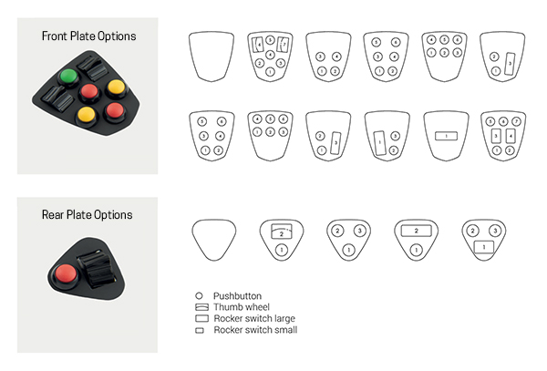 The G56 offers a high degree of flexibility with a selection of individually configurable front and rear plates that can be populated with push-buttons, rocker switches, and thumbwheels. Unique to the G56, capacitive hand sensor technology is also available as an option.