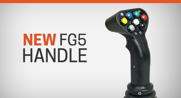 The FG5 boasts a twist 3rd-axis Hall-effect signal with spring return to center. A removable panel can be configured with a combination of different buttons, thumbwheels, rocker switches and toggles. Its faceplate can accommodate up to 7 push buttons in addition to a true trigger. This robust handle is compatible with J.R. Merritt’s CS3VHD, PRO4, XLVNSO, VNSO, VNS2, NNSO and NS3 joystick controllers, as well as all standard 8mm shaft couplings.