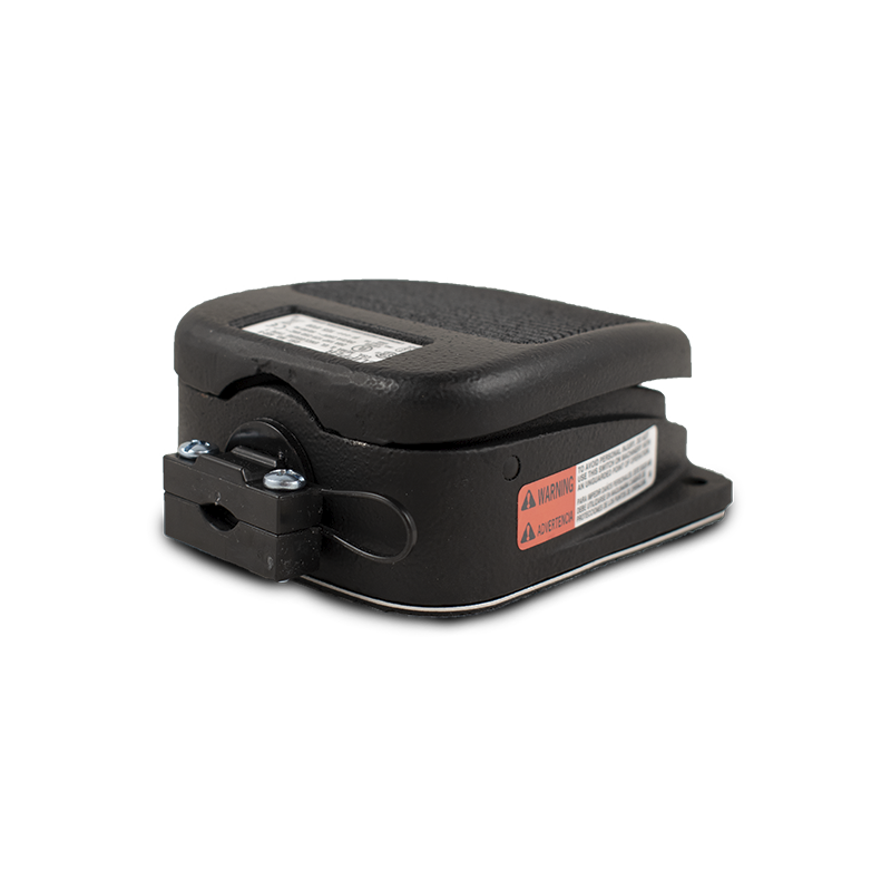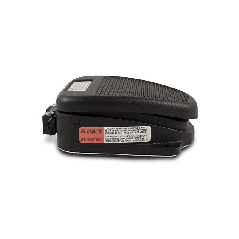 Industrial momentary foot pedal with black finish and anti-skid base. Features a SPDT (single pole double throw) with 1 NO and 1 NC contact. Capable of switching 20 AMP AC loads or low voltage non-inductive DC loads.