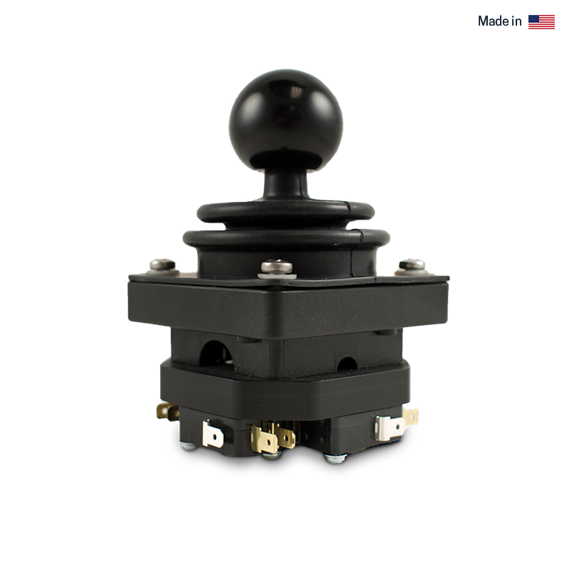 Ultra compact joystick often used in bang / bang (on / off) applications. Also available with potentiometers that mount on the inside of the joystick body.
