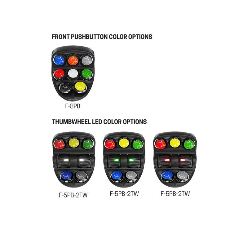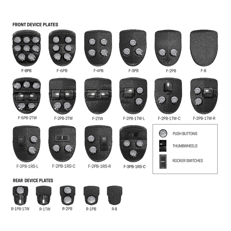 4 standard rear device plates are available with optional button and thumbwheel combinations. Optional push buttons in trigger location are also available.