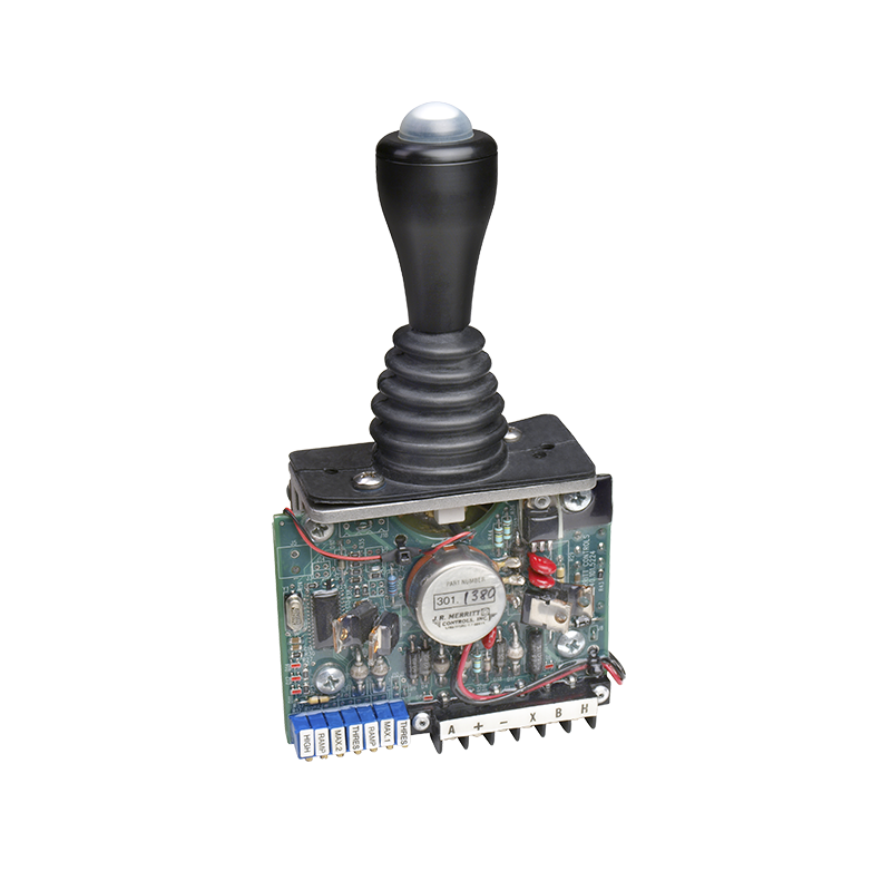 Single axis joystick with NEMA 4 environmental sealing and a versatile design that accommodates a variety of handle options and outputs.